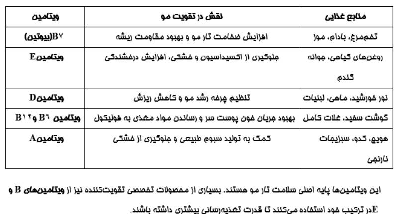· پروتئینها: تخممرغ، ماهی، مرغ و حبوبات، که ساختار تار مو را مستحکم میکنند.
